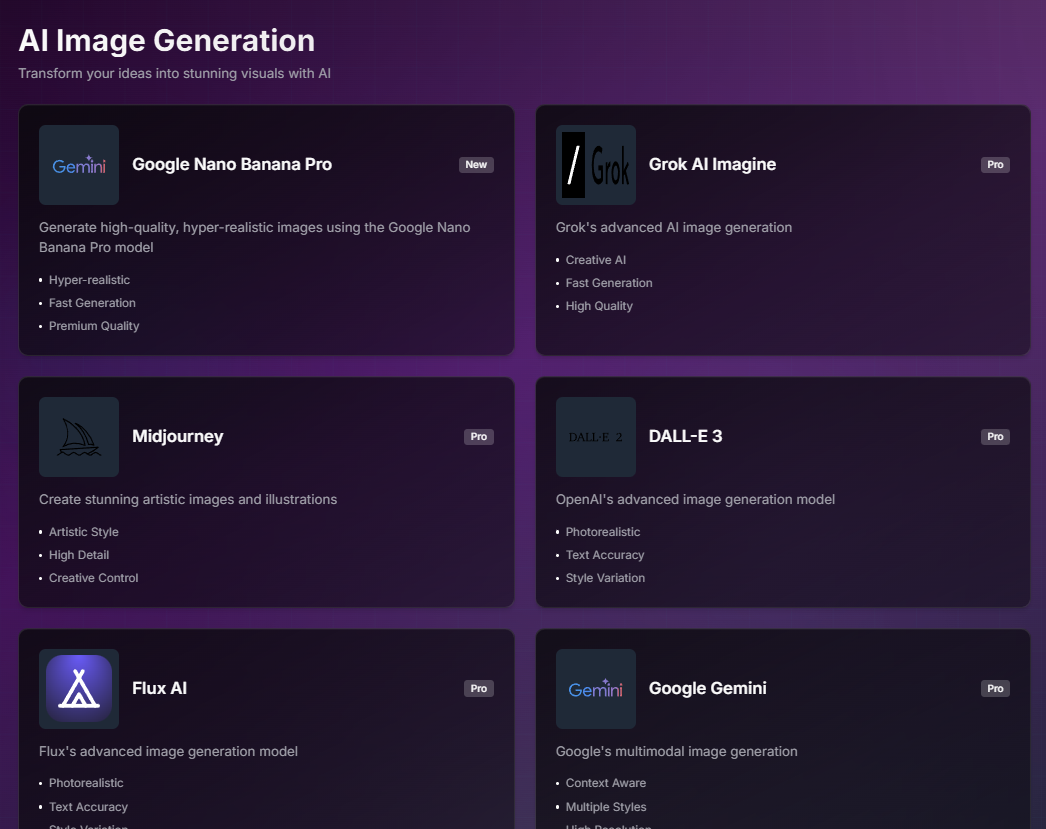This manual explains how to use the unified AI platform that integrates multiple AI engines such as Nano Banana Pro, DALL-E 3, Gemini, and Midjourney.