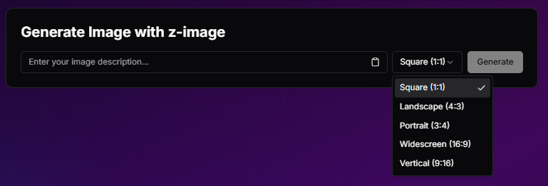 - Select image size (e.g., 1:1, 16:9).